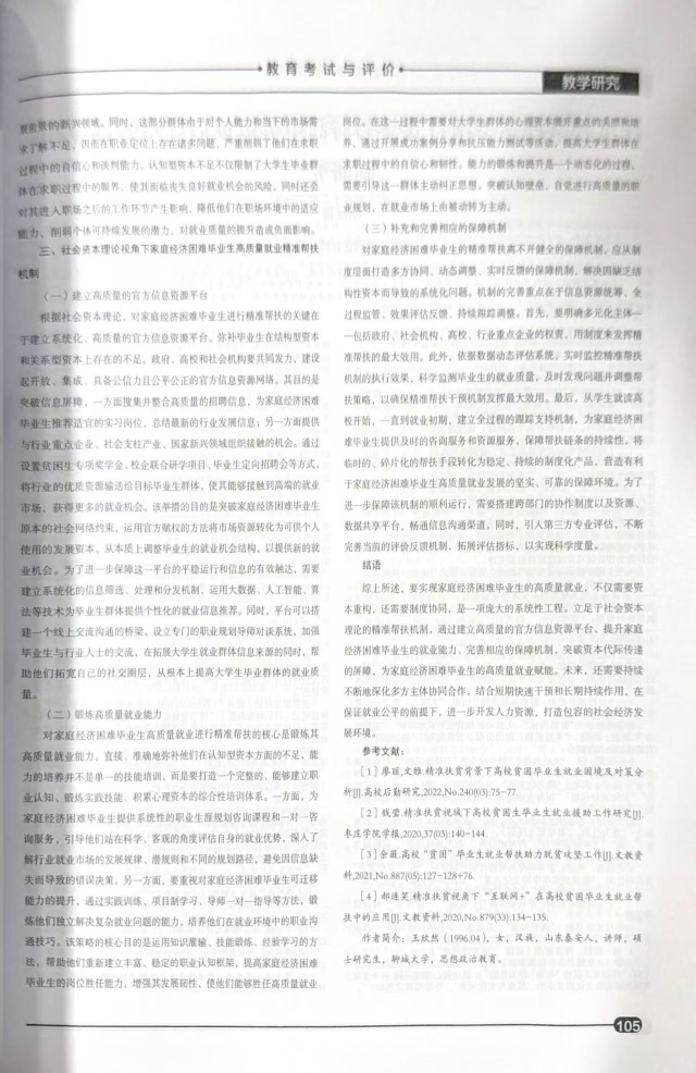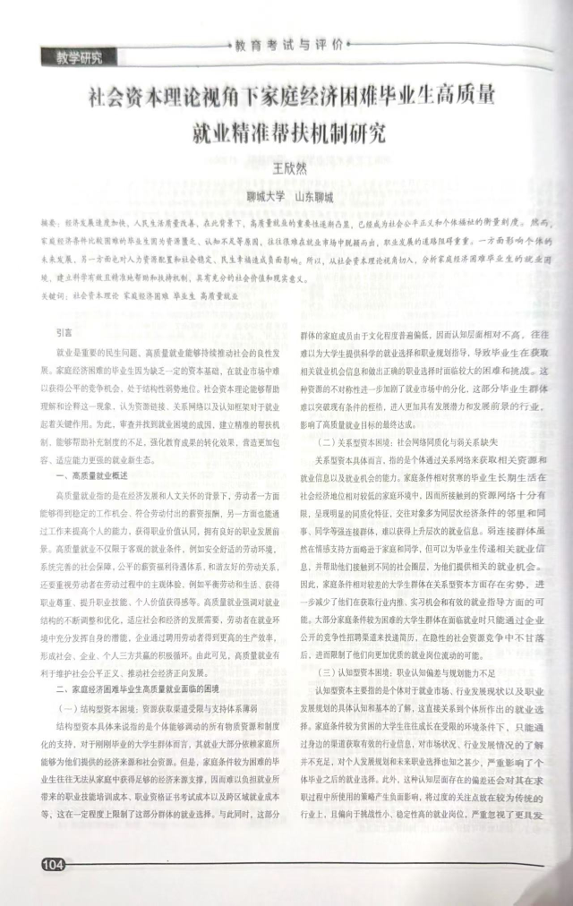 9月,色情网 王欣然老师在《教育考试与评价》2025年9月第18期发表一篇名为《社会资本理论视角下家庭经济困难毕业生高质量就业精准帮扶机制研究》的文章。