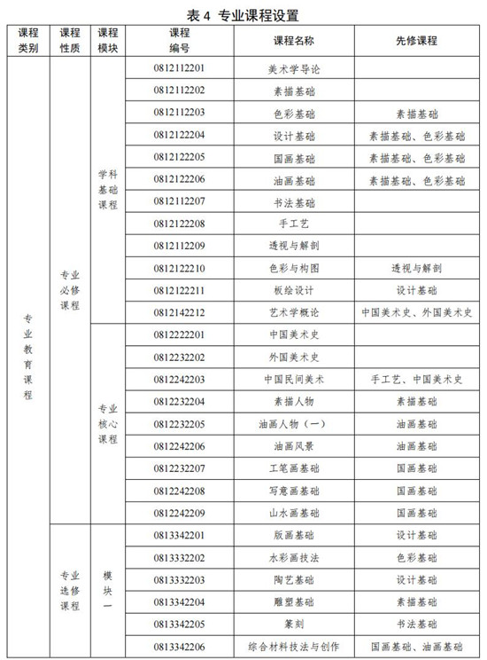 主要课程:设计基础、国画基础、油画基础、书法基础、中国美术史、外国美术史、艺术学概论、素描人物、油画人物、油画风景、工笔画基础、写意画基础、山水画基础、发展与教育心理学、教育学概论、美术课程与教学论、美术课程标准及教材研究等。