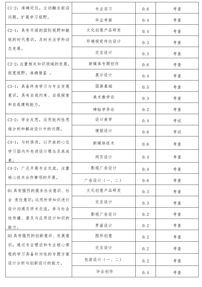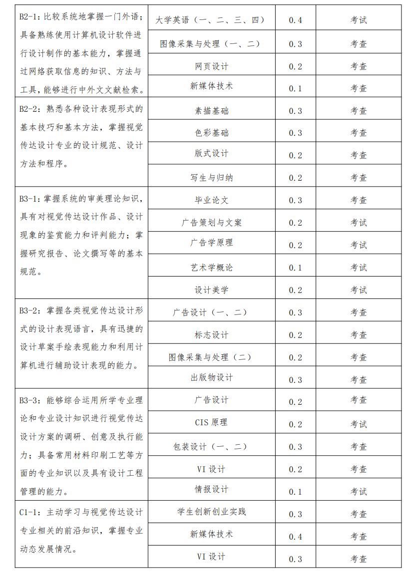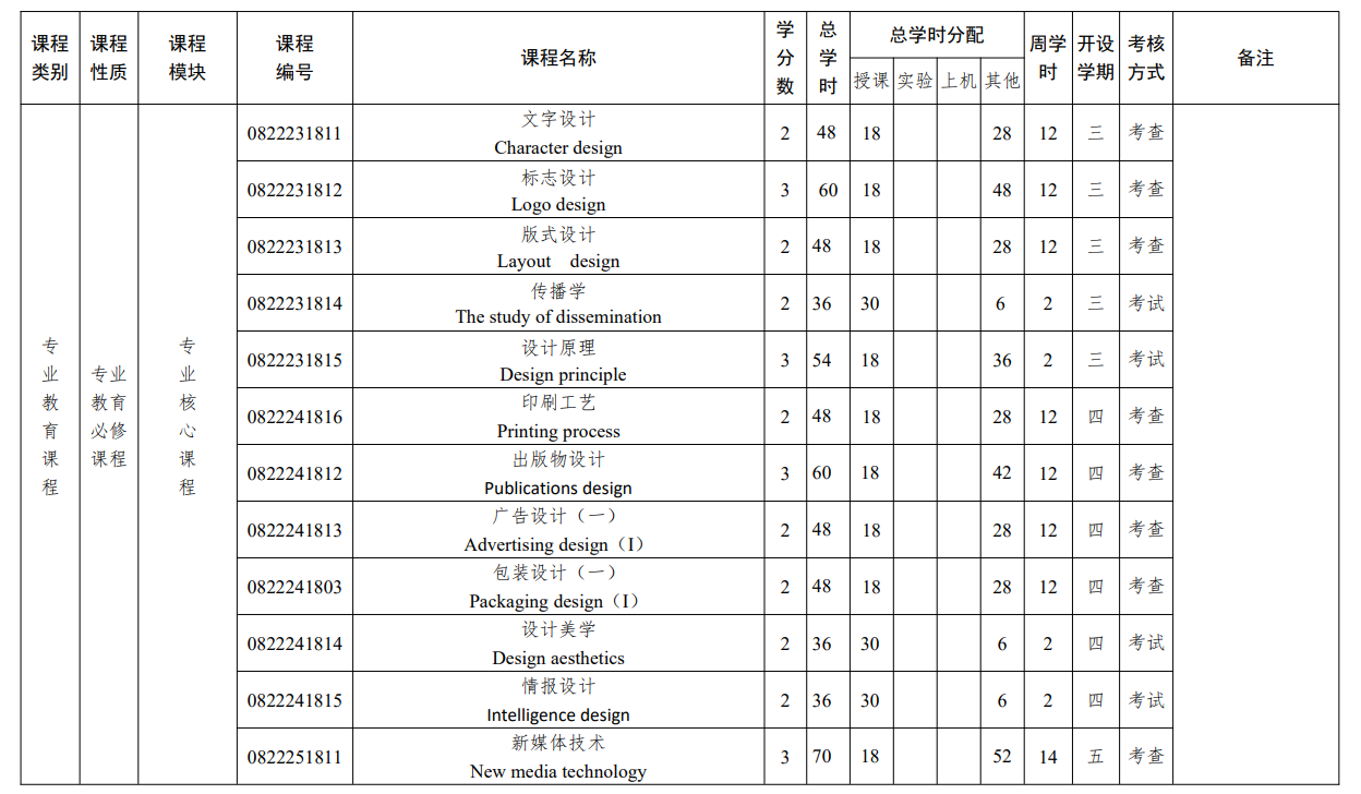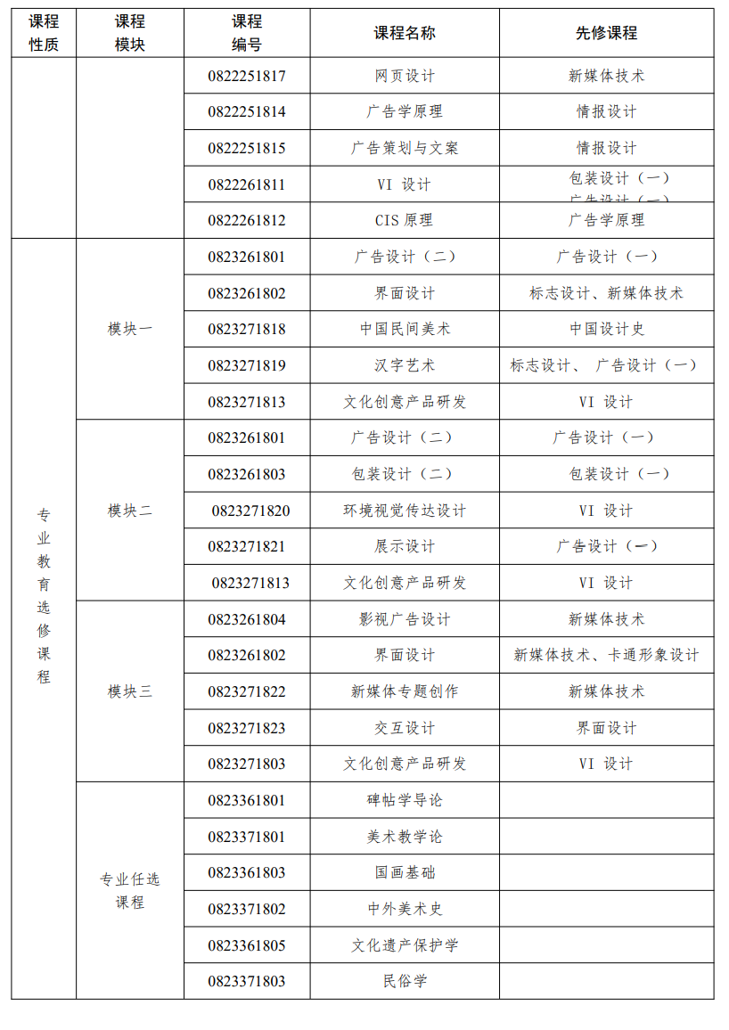 4 主干学科:设计学、艺术学。 主要课程:素描基础、色彩基础、装饰基础、构成设计基础、创意思维与表现、文字设计、图 像采集与处理(一、二)、标志设计、版面设计、印刷工艺、广告设计(一、二)、包装设计(一、 二)、新媒体技术、界面设计、VI 设计、影视广告设计、展示设计、中国设计史、西方设计史、艺 术学概论、传播学、设计原理、广告学原理、广告策划与文案、设计美学、情报设计、CIS 原理等。