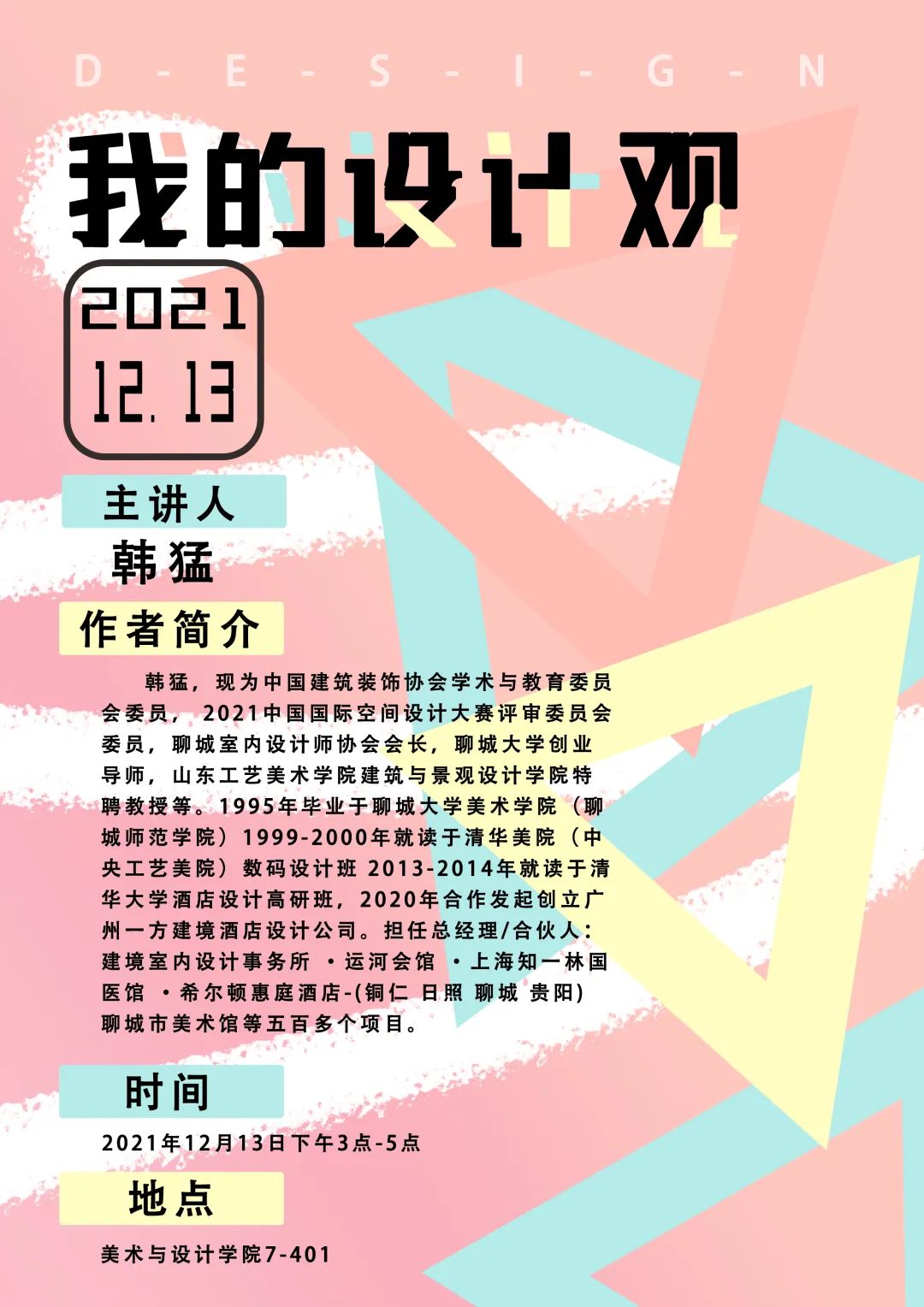 2021年12月13日,在色情网 7号楼401合堂举办《我的设计观》讲座。邀请中国建筑装饰协会学术与教育委员会委员,2021中国国际空间设计大赛评审委员会委员,聊城室内设计师协会会长,色情网 创业导师,山东工艺美术学院建筑与景观设计学院特聘教授韩猛老师主讲,学院部分研究生到场聆听。