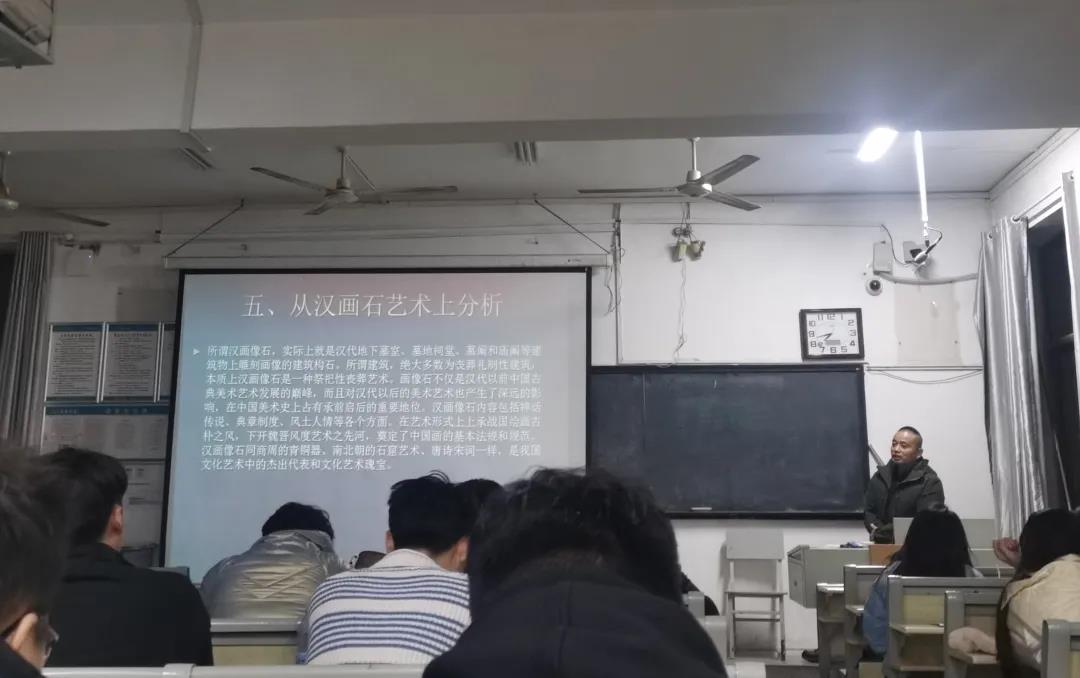 黄海燕老师主要从五大方面为我们展开讲述了武当庙的艺术形式:第一,从建筑形式上。武当庙具有元代和明代风格的特色。第二,从雕塑形式上。武当庙具有唐宋以来的大气与浑厚,也具有元代元素,奇特威武,兼容儒释道的特色。第三,从壁画形式上。在西面墙壁上的壁画,据传为“鸡嘴雷神牛头马面”,同时还有一个无头之神手捧龙头。在东面墙壁上的壁画,据当地居民传说是二十八宿,现代又称之为二十八星宿。第四,从屋脊瓦当艺术形式上。瓦当是实用于古代建筑上的瓦附件,具有实用价值又具有装饰功能;屋脊是古建筑物对于屋面交界线或边沿线的特殊处理而产生的构造形式,一般分为正脊、垂脊、戗脊、博脊。第五,从汉画石艺术上。汉画像石在艺术形式上上承战国绘画古朴之风,下开魏晋风度艺术之先河,奠定了中国画的基本法规和规范。黄海燕老师评价画像石不仅是汉代以前中国古典美术艺术发展的巅峰,而且对汉代以后的美术艺术也产生了深远的影响,在中国美术史上占有承前启后的重要地位。