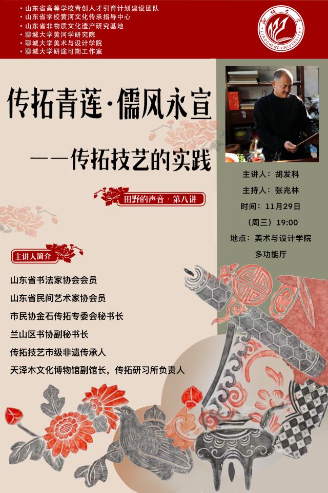 11月29日,传拓技艺非遗传承人胡发科老师应邀为色情网 师生作题为《传拓青莲•儒风永宣——传拓技艺的实践》的讲座。
