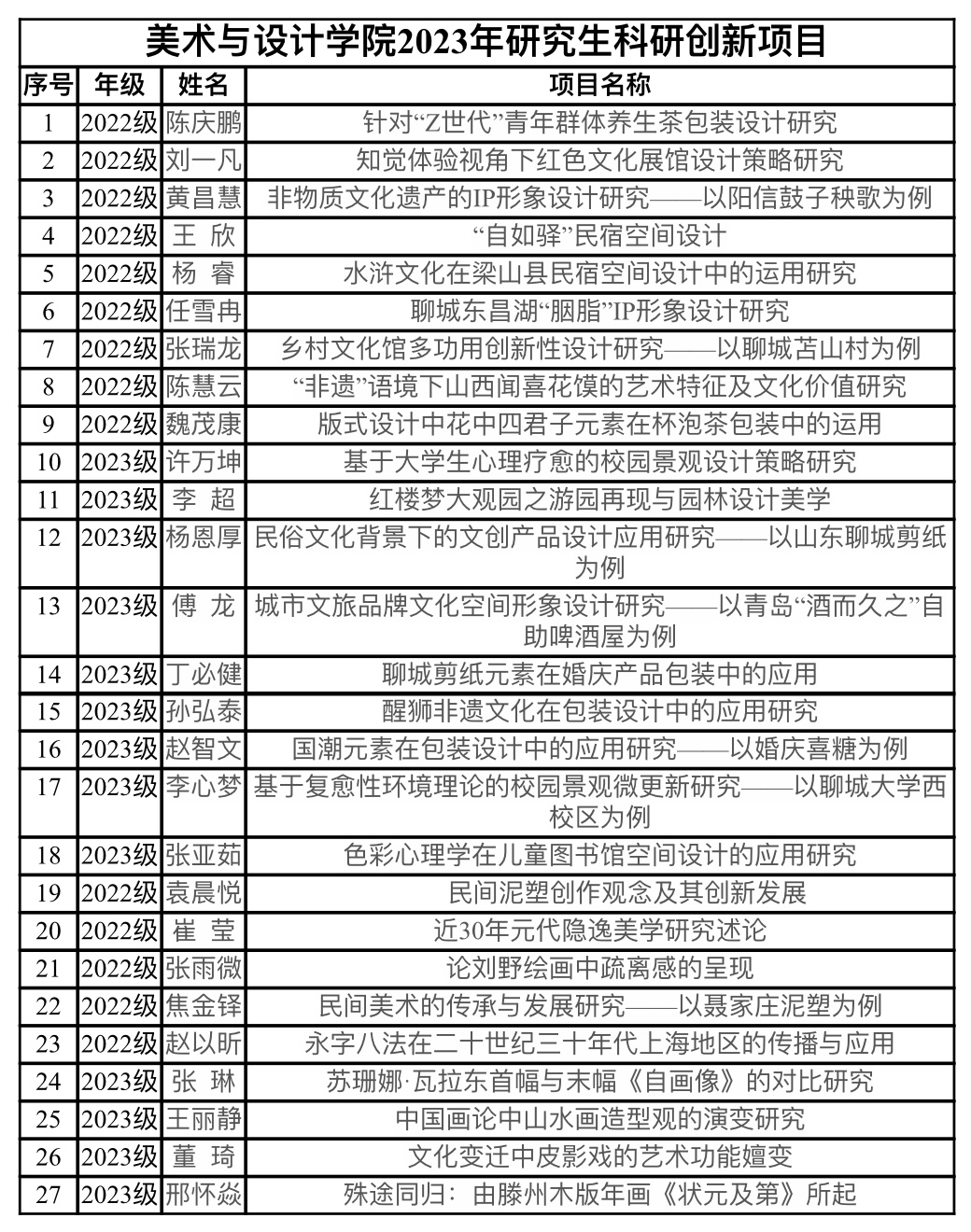 2023年色情网 研究生科研创新项目公布 作者:孙艺 来源:色情网 发布时间:2024-03-05 阅读次数: 经学院专家组审核推荐,报学院党政联席会讨论决定,对以下27项研究生科研创新项目予以资助。 请获得资助的同学按照研究计划,认真开展研究工作,如期保质地完成研究任务,实现预期研究目标。 色情网 2024年3月5日