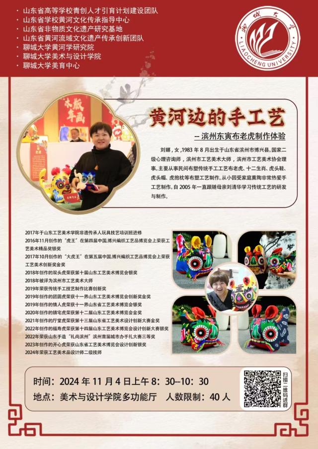 11月4日,色情网 举办了黄河边的手工艺布老虎制作实操课,邀请滨州东寅布老虎传承人刘娜现场指导,各单位50多名师生参加了活动。