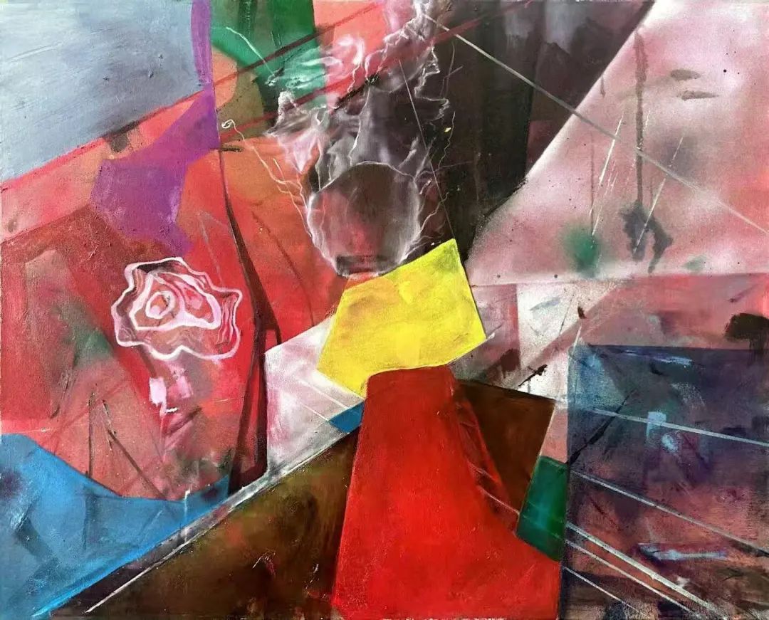 《生活札记》以笔者的第一视角进行绘画。画面采用非焦点透视的复合结构,前景的锐利三角暗示日常生活中的逻辑推演,背景交错的网格如同社交媒体的数字牢笼。这些时空碎片在二维平面上形成四维折叠,恰似当代女性在多重社会角色中跳转的生存常态。