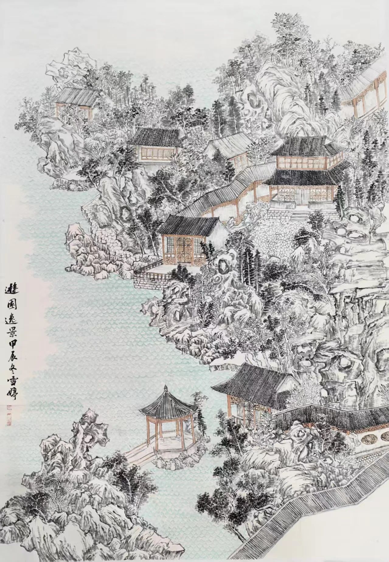 《游园逸景》是一幅园林山水画作品,其表现对象为享有“江北第一私家园林”美誉的宛园。画作以细腻的笔触、淡雅的色彩,将宛园的精巧景致一一展现。画面中亭台楼阁错落有致,树木形态各异,枝繁叶茂,运用丰富的墨色和笔法,展现出它们的生机与姿态和园林的古朴宁静。园内湖水留白的处理扩大了画面空间留下来想象空间。作品旨在描绘宛园景色,传达园林文化魅力。